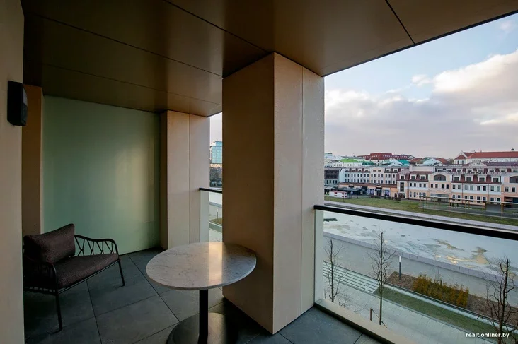 Diplomat Suite (ad $900). Płošča 82 «kvadraty». Tut jość spalnia, haścioŭnia z kuchniaj, harderobnaja i vialiki bałkon z panaramnym vidam na centr horada.
