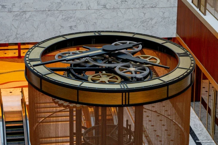 Samy znakavy elemient u łobi — instalacyja z hadzińnikam vyšynioj 9,5 mietra ŭ centry atryuma. U kožnym hateli sietki jość svaje vialikija hadzińniki — heta danina historyi. Kažuć, minskaja interpretacyja atrymałasia samaj vysokaj. U jaje raspracoŭcy ŭdzielničali niekalki krain: dyzajn z Anhlii, miechanizm z Hiermanii, asnova ź Italii, a dekor — ź Biełarusi (łancuhi simvalizujuć mastactva placieńnia z sałomy).