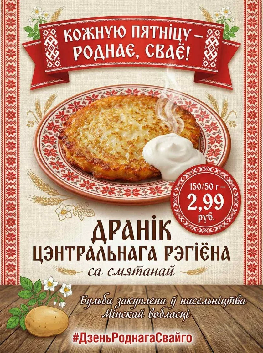 Pavodle paviedamleńnia arhanizacyi, draniki buduć hatavać z samaj śviežaj bulby, zakuplenaj niepasredna ŭ žycharoŭ Minskaj vobłaści. Porcyja abiacaje być sytnaj: 150 hramaŭ dranikaŭ i 50 hramaŭ śmiatany. Košt takoj stravy składzie 2 rubli 99 kapiejek.