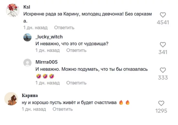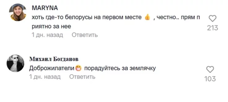 — Ščyra radaja za Karynu, małajčyna dziaŭčyna! Biez sarkazmu» (Hety kamientar sabraŭ zvyš čatyroch z pałovaj tysiač łajkaŭ).