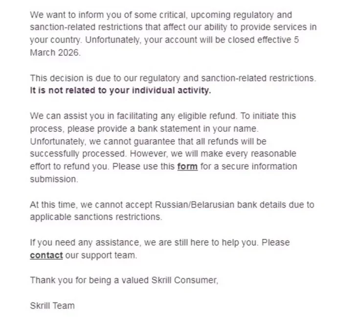 Elektronnaja apłatnaja sistema Skrill, zasnavanaja ŭ Łondanie, pačała błakavać rachunki biełarusaŭ. Karystalniki atrymlivajuć paviedamleńni, što «sankcyjnyja abmiežavańni ŭpłyvajuć na mahčymaść akazańnia pasłuh u vašaj krainie», piša Office Life.