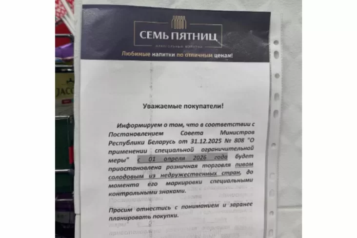 U sacsietkach źjavilisia fatahrafii abjaŭ z kram rytejlera «Siem piatnic». U ich skazana, što z 1 krasavika 2026 hoda budzie prypynieny roźničny handal pivam soładavym ź niedružalubnych krain da momantu jaho markiroŭki śpiecyjalnymi kantrolnymi znakami.