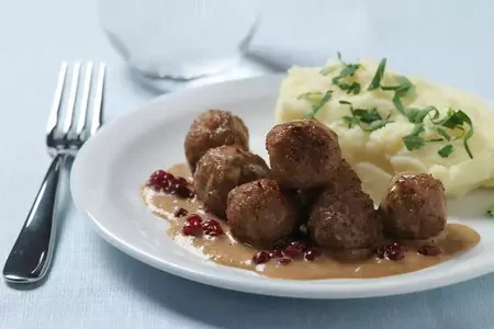 Tradycyjnyja šviedskija frykadelki ź piure i bruśničnym sousam55