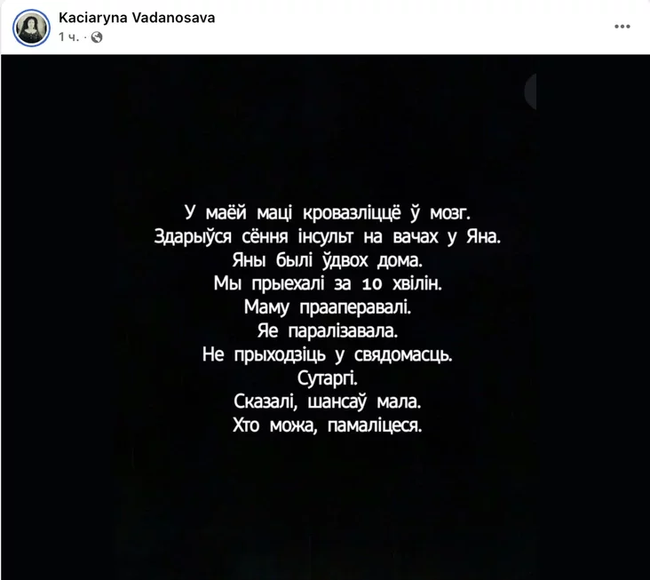 "My mother had a brain hemorrhage. The stroke happened today in front of Yan. They were home alone. We arrived in 10 minutes. Mom was operated on. She is paralyzed. Not regaining consciousness. Convulsions. They said there's little chance. Whoever can, please pray," Katsiaryna Vadanosava wrote.