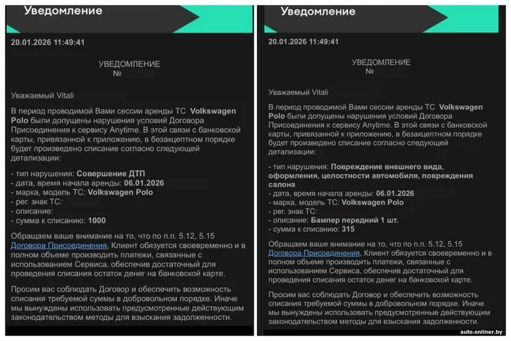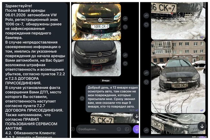 "The fact of damage was established based on the chain of rentals (Vitaly's and the previous client's) and photo documentation. Before Vitaly's rental, the car was recorded by the previous client as undamaged. Vitaly began his rental without photo documentation of the car's condition, however, upon completing the rental, he independently took photos showing a crack on the bumper," Anytime told an Onlíner journalist.