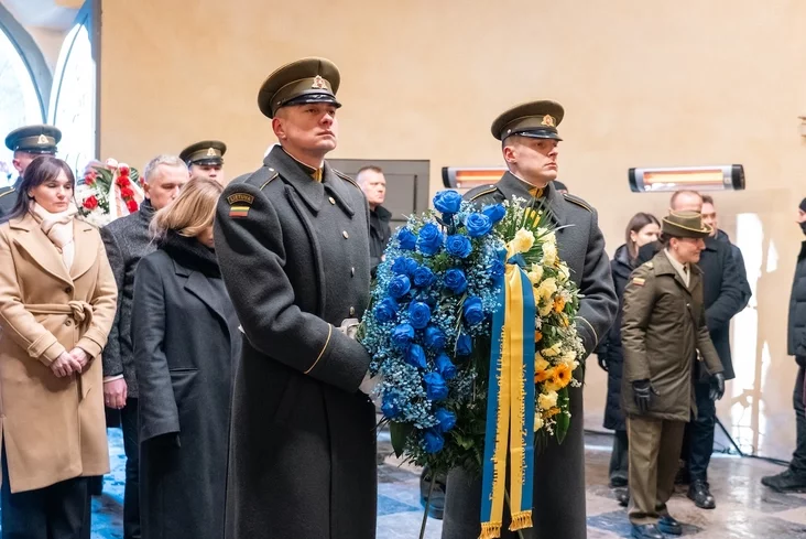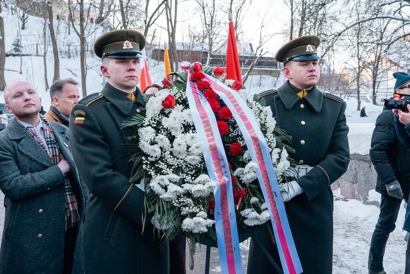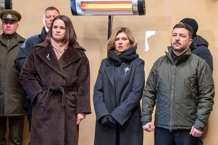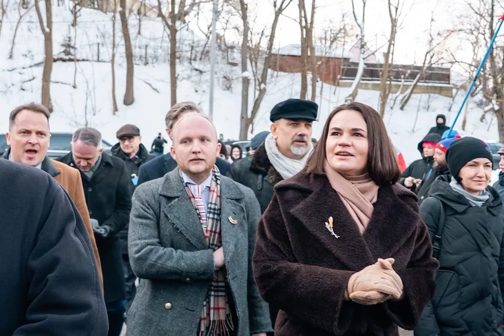 Lithuanian President Gitanas Nausėda, Polish President Karol Nawrocki, Ukrainian President Volodymyr Zelenskyy, and Belarusian democratic forces leader Sviatlana Tsikhanouskaya arrived to lay flowers. A brooch with yellow and blue ears of grain could be seen on Tsikhanouskaya's coat.