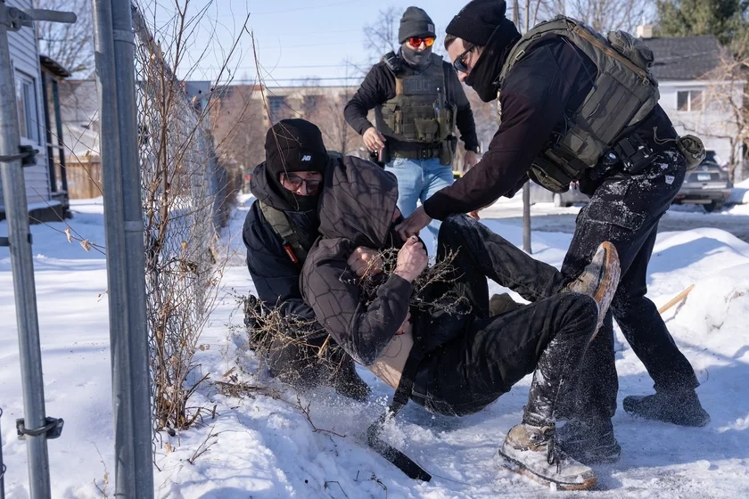 Immigration agents detain a protester in Minneapolis. Photo: Alex Kormann/The Minnesota Star Tribune via Getty Images