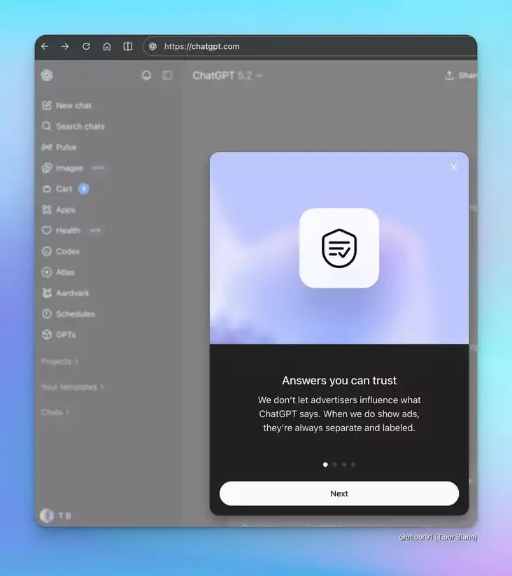 Warning about the appearance of ads in ChatGPT. Photo: btibor91/twitter.com