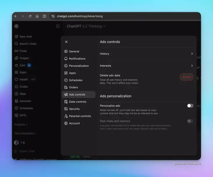 For those concerned about privacy, an "Ads control" settings page is provided, where personalization based on memory and history can be disabled, although context-based advertising from the current conversation will still remain.