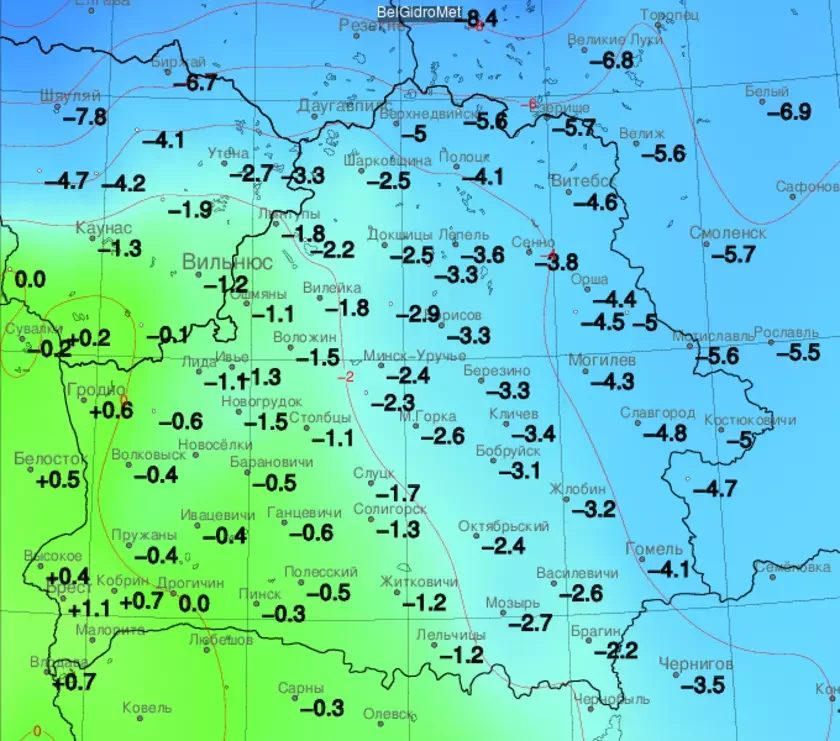 In Minsk it was minus 2.4°C. And in the vicinity of Brest and Grodno, it was even above zero at night. In Brest +1.1°C. In Iŭje it was 1.3°C.