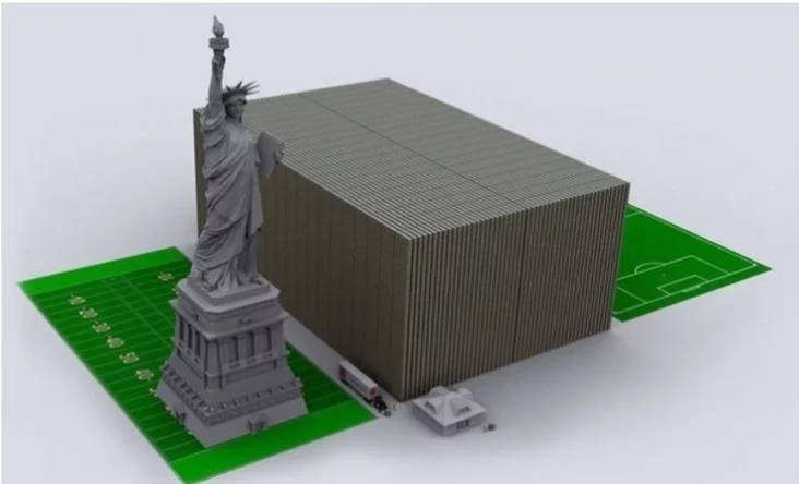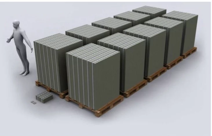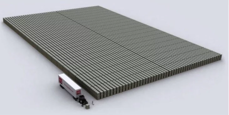 Портал fototelegraf.ru предлагает наглядное сравнение, в геометрическом смысле, различных круглых сумм в долларовом выражении — от одной купюры в $100 до величины госдолга США, составленного из пачек этих купюр.