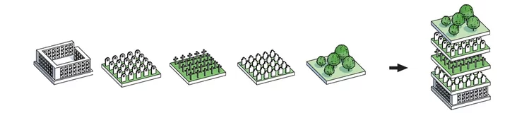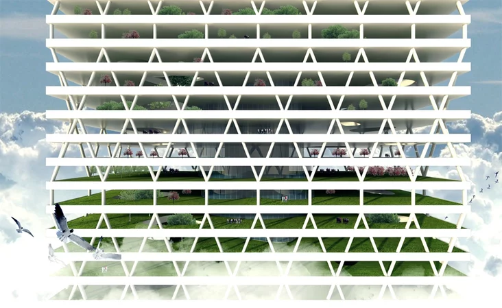 Вертикальное кладбище студент-дизайнер предлагает строить в виде экзоскелета небоскреба, на каждом этаже которого располагается лужайка, где можно разместить определенное количество могил. Каждый этаж будет «тематическим» — для захоронений по различным религиозным или общественным канонам.