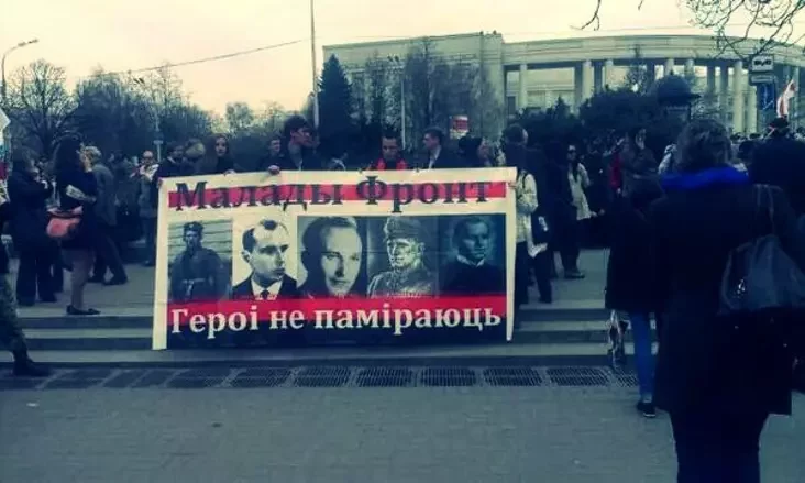 Молодые люди держат растяжку с портретами Бандеры, Шухевича, Булак-Балаховича, Витушки и Годлевского и надписью «Герои не умирают».