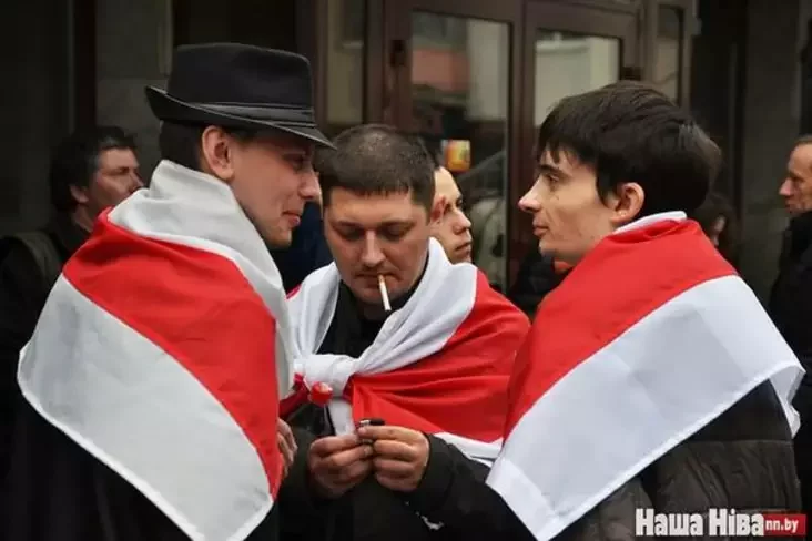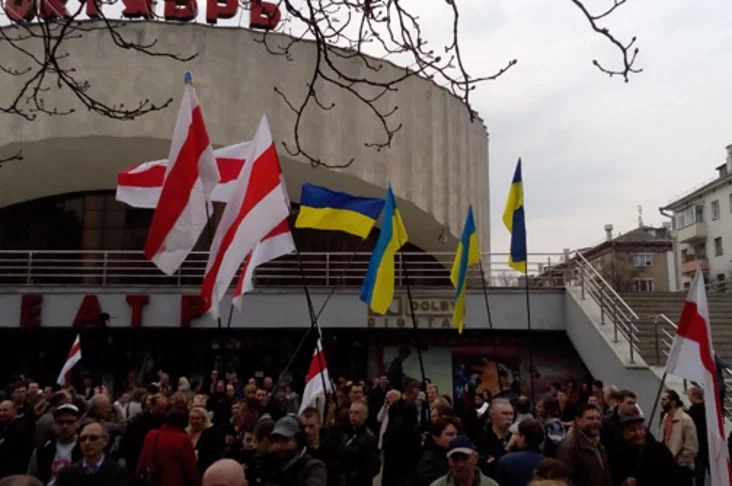 На площадке перед кинотеатром «Октябрь» собираются люди. Их уже около двухсот человек. Над собравшимися поднялись первые бело-красно-белые флаги.