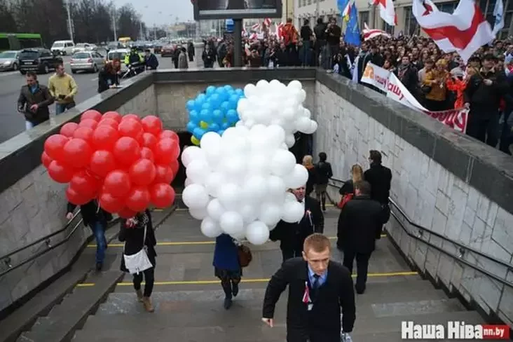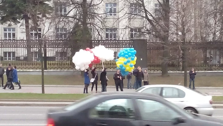К акции присоединились участники с гигантскими связками бело-красно-белых воздушных шаров, штук по 20-30.