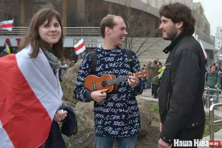 Желающим раздают желто-голубые ленты в знак солидарности с Украиной. Раздают и текст гимна «Мы выйдзем шчыльнымi радамi».