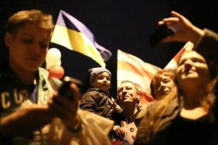 Участники скандируют «Россия — оккупант!», поют «Мы выйдзем шчыльнымі радамі».