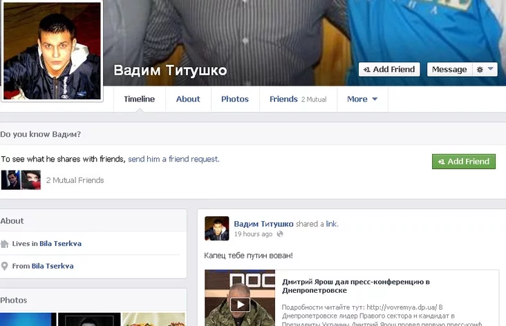 В социальной сети «Фейсбук» он размещает антироссийские статусы и требует, чтобы оккупанты ушли домой.