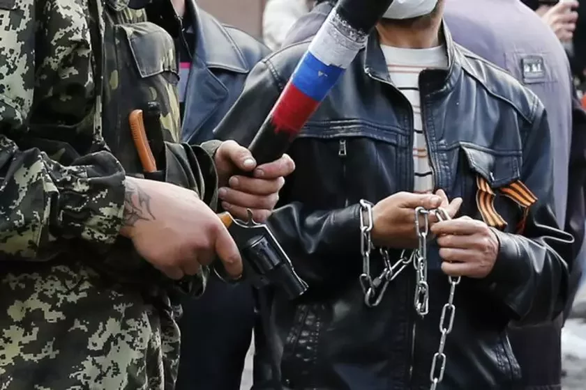 Баевікі з георгіеўскімі стужкамі і зброяй падчас сутычак у Адэсе, 2 мая. Фота Ройтэрз.