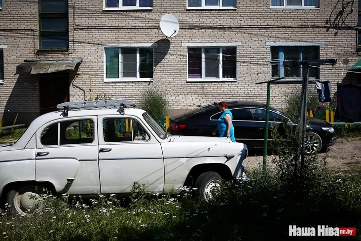 А за ёй, каля аграсядзібы «Дастатак», гламурнае чучала селяніна ў вышыванцы…