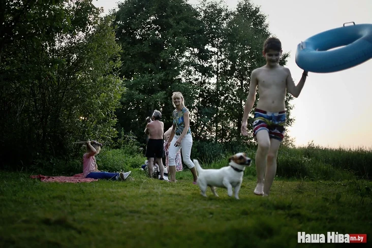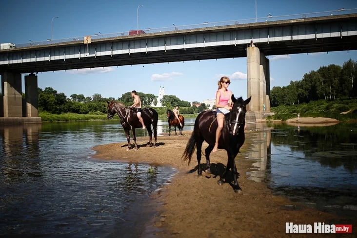 На другім беразе Дзвіны, на пясчаных пярэспах, пад занядбаным паркам купаемся. Удача — ніжэй па цячэнні юнакі купаюць коней. Дзвіна плыткая. Амаль да самага другога берага — па пояс. Але плынь нясе моцна, дзяцей нельга пакідаць.