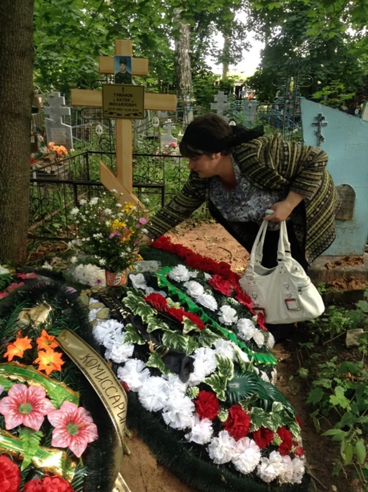 Сидя в гостиной на диване, на котором раньше спал Антон, его мама Елена Петровна Туманова поправляет на коротких седеющих волосах черную повязку, ищет в сумке свидетельство о смерти — зачем-то она носит его с собой.