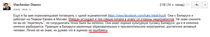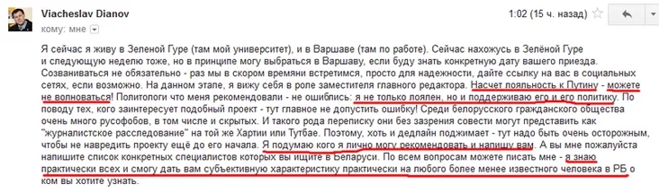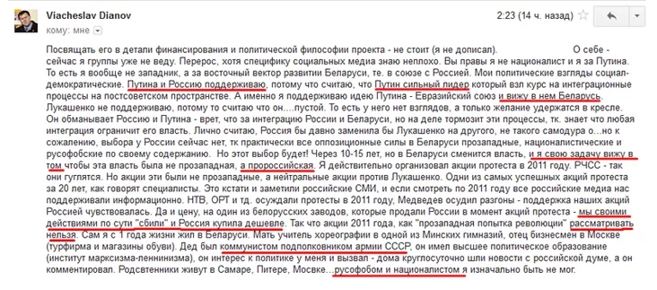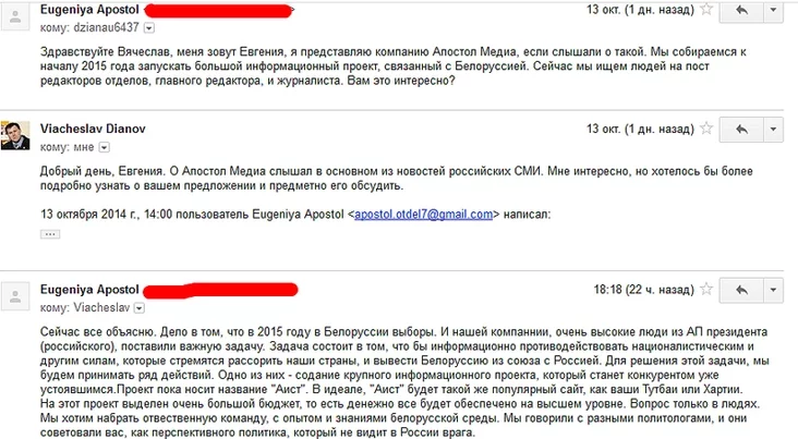 В частности, Дианову предложили возглавить информационный проект «Аист», который должен стать альтернативой «тутбаю» и «хартии» и «противодействовать белорусским националистам» накануне выборов 2015 года.