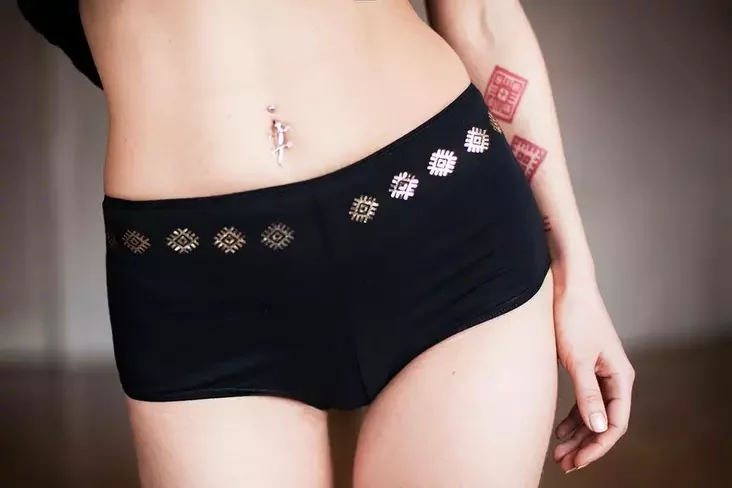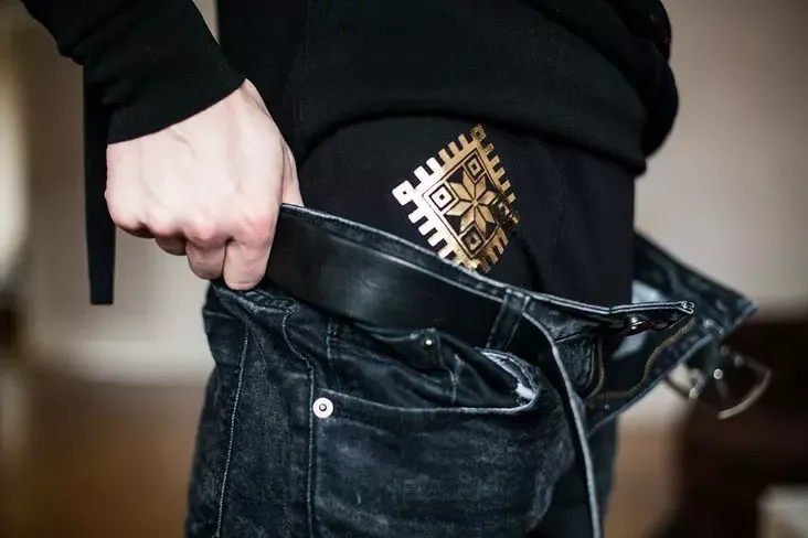 В фотосете приняли участие лидер группы Руся и музыкант Алексей Будько. Оба выбрали черные модели трусов с золотистым «вышиванковым» принтом. Автор фото: Анна Дрозд.