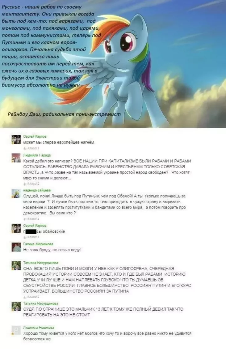 Глава общины Артем Крашенинников забросил в группу сторонников Путина на «Одноклассниках» картинки с фальшивыми цитатами Рамзана Кадырова (он будто бы говорит, что спас первого русского в 16 лет, на самом же говорил, что убил) и Владимира Путина (он якобы называл своего политического оппонента Алексея Навального достойным преемником).