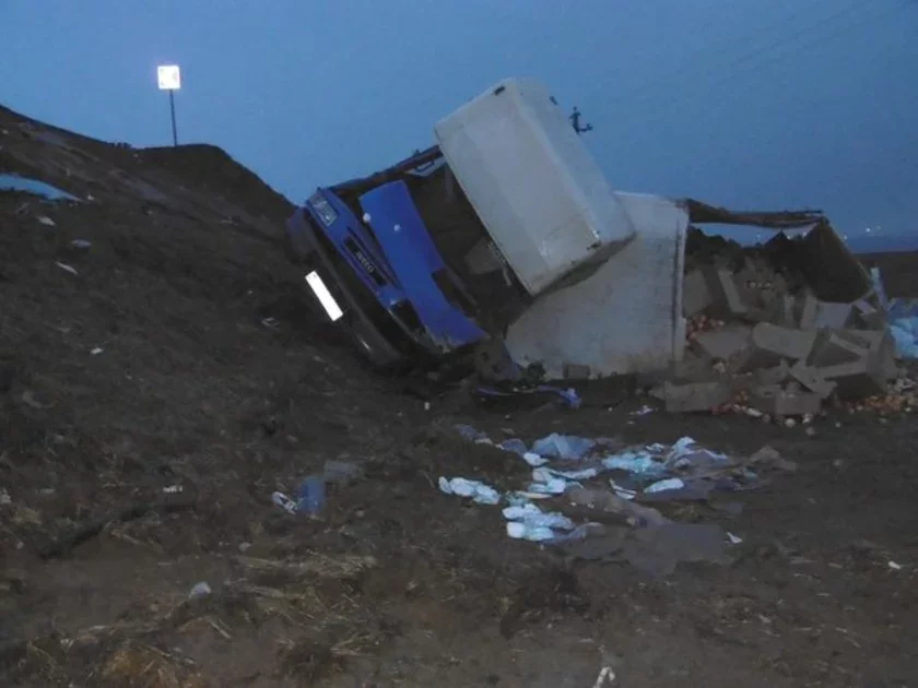 Спускаясь с горки в условиях тумана водитель ошибся с выбором скорости. Автофургон повредил восемь пролетов ограждения, перескочил через него и лег на водительскую сторону. Из проломанной изотермы ящики с фруктами вывалились наружу. Водителя с многочисленными травмами госпитализировали.