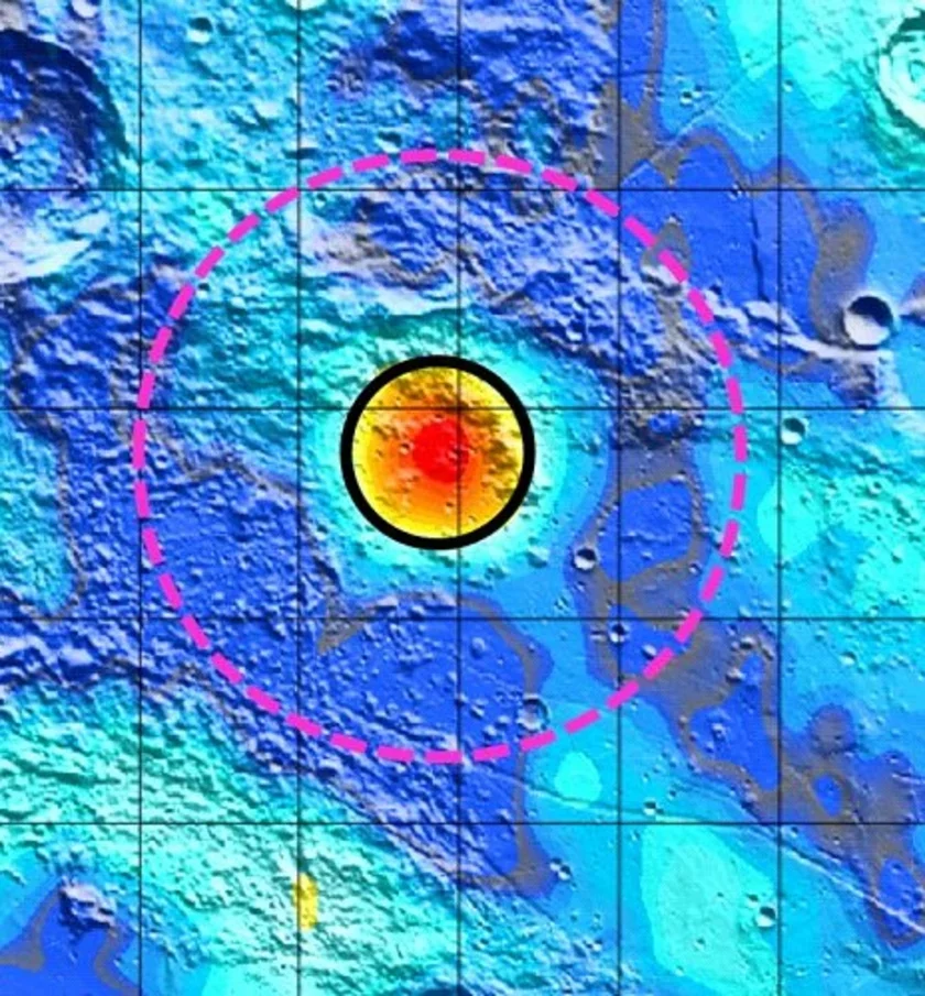 Ученые увидели его следы во время поиска доказательств существования грунтовых каналов, по которым когда-то могла перемещаться лава — так называемых лавовых труб. Чтобы объяснить необычную топографию местности около Моря Спокойствия, ученые применили математическое моделирование, результаты которого и доказывают существование гигантского скрытого кратера.
