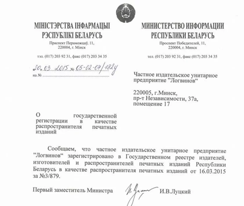 Министерство информации выдало книжном магазине «ЛогвінаЎ» лицензию на торговлю печатной продукцией. Она зарегистрирована в государственном реестре за №3/879 от 16 марта 2015 года.