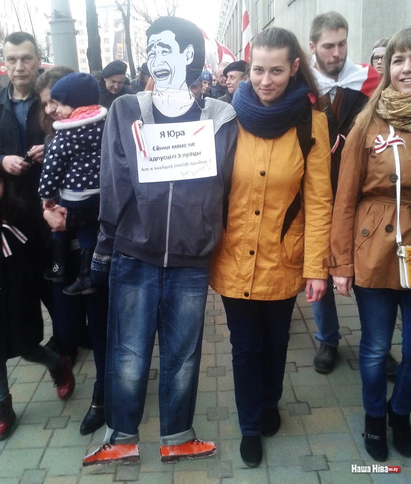 Девушка принесла с собой картонный манекен, одетый в одежду своего друга, чтобы выразить протест против неуважительного к людям решения Мингорисполкома перенести празднование на рабочее время.