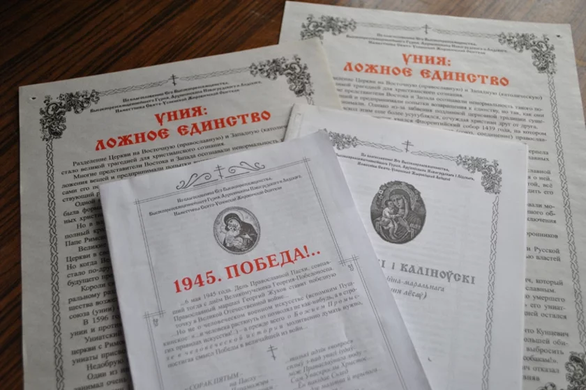 Брошюру «1945. Победа!..» распространяют через церковные лавки в Гродно. Согласно версии автора, в войне русские победили благодаря обращению бывшего семинариста Сталина к вере, возвращению золотых погон царской армии и разрешению вывозить икону Казанской Божией Матери на фронт.