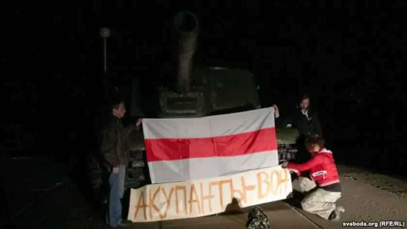 Общественные активисты Ольга Миколайчик, Андрей Мельников и Леонид Кулаков подготовили к встрече «путинских» байкеров плакат «Оккупанты — вон», желто-синий и бело-красно-белый флаги и портрет погибшего на Майдане белоруса Михаила Жизневского.