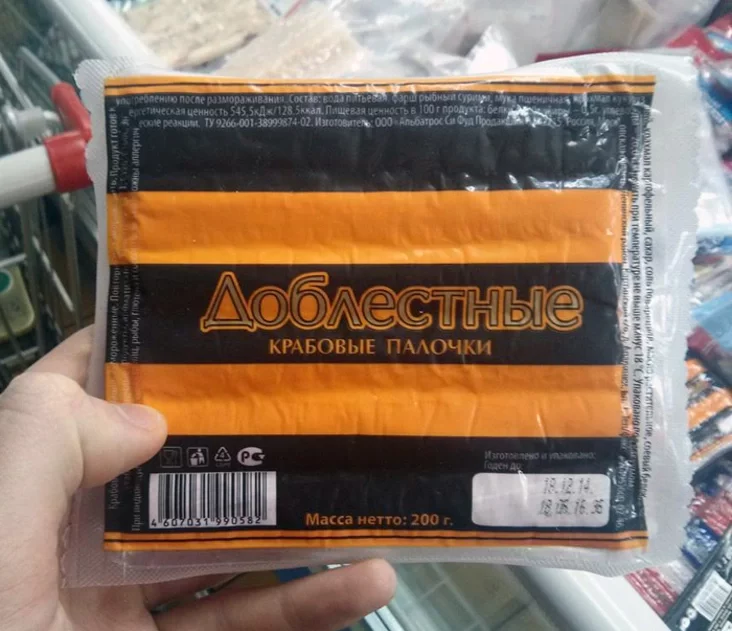 В этом году внимание пользователей Интернета привлекли крабовые палочки «Доблестные». Интернет-сообществе тут же распространило их фото с подписью «Крабы воевали».