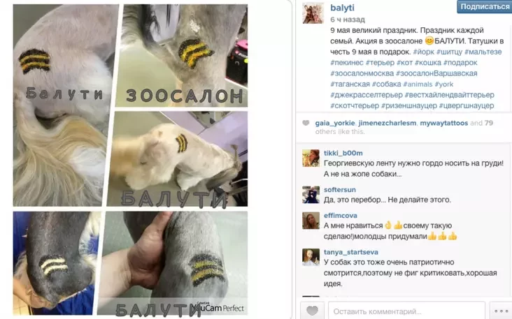 P.S. А московский зоосалон «Балути» в честь Дня Победы предложил бесплатно нанести татуировку в виде георгиевской ленты собакам, которые в нем постригутся. Фотографии с примерами работ салон разместил в официальном инстаграме. Позже фото удалили, но скриншот успел разлететься по соцсетям.