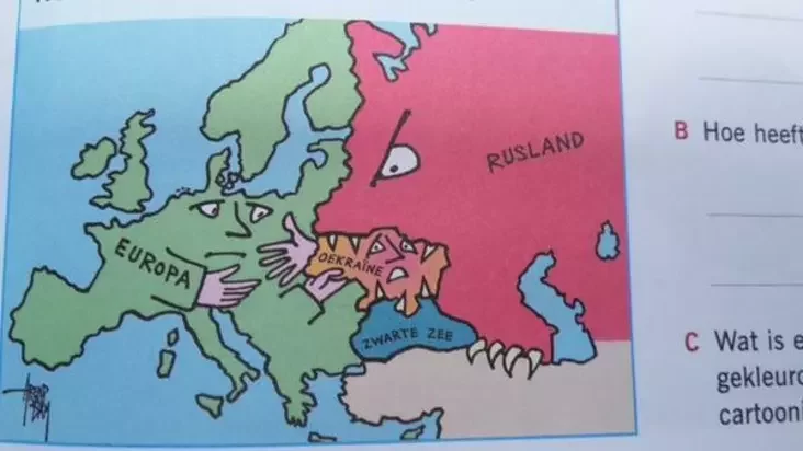 Датский учебник для школьников показывает ситуацию в Европе: Россия в образе чудовища с клыками хочет проглотить Украину, которая протягивает руку за помощью европейским странам. Самое интересное на этой карте — что Беларусь также включена в состав России и изображается как часть верхней челюсти чудовища.