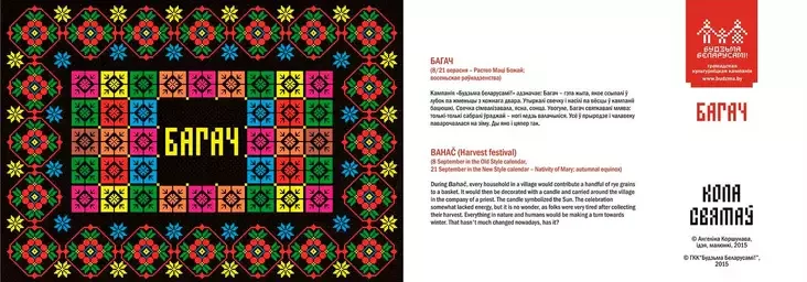 «Спачатку я імкнулася перадаць сутнасць кожнага свята праз асобны сімвал арнаменту, — тлумачыць Ангеліна. — Але пасля больш глыбокага вывучэння тэмы і асабліва пасля кансультацыі, што мне арганізавала кампанія «Будзьма!» з доктарам мастацтвазнаўства Вольгай Лабачэўскай, я прыйшла да высновы, што з арнаменту нельга вырываць асобныя знакі (гэта ж як вырваць літары з верша, ноты з мелодыі — ніякага сэнсу!), бо гэта сістэма, якая характарызуецца завершанасцю, рытмам, цэласнасцю. Таму за аснову я ўзяла вобраз, які павінная несці арнаментальная кампазіцыя».