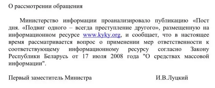 Несколько дней назад Вячеслав Дианов опубликовал ответ замминистра информации Игоря Луцкого, где говорится, что «в данный момент рассматривается вопрос о применении мер ответственности к соответствующему информационному ресурсу». Спустя четыре дня kyky.org заблокировали.