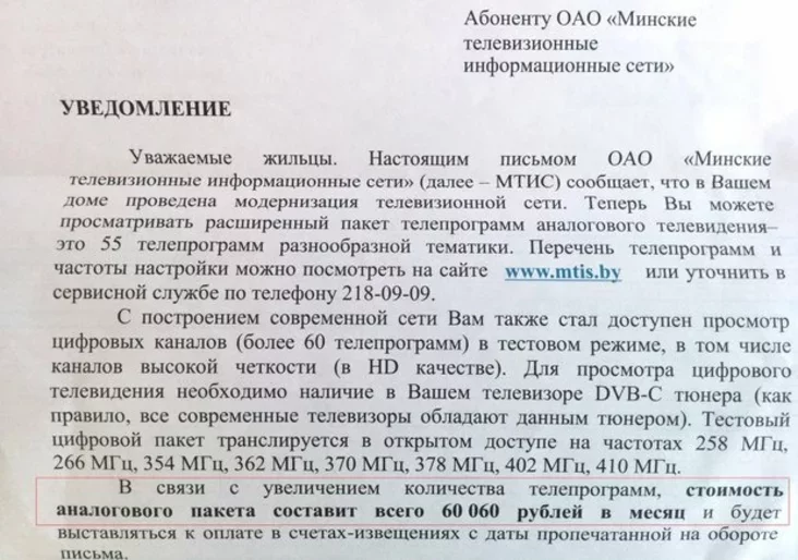 В последние месяцы крупнейший минский кабельный оператор МТИС модернизирует свои телевизионные сети. Причем, самые дешевые пакеты телепрограмм оказываются недоступны для абонентов, а стоимость услуг вырастает в несколько раз.