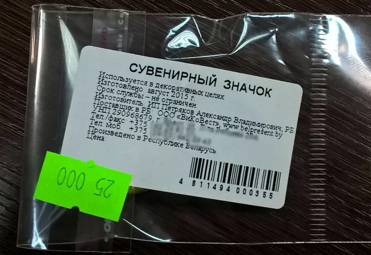Изготовитель значка – ИП Петряков А.В. из Бреста. Продажей сувенирных значков занимается ООО «Виковест». Образец этого значка размещен и на сайте компании.