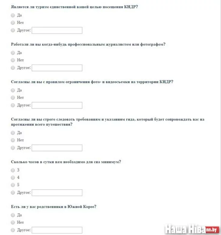 В мае 2016 года из Минска в Пхеньян планируется вылет знаменитого ТУ-154. 150 смельчаков полетят в Северную Корею знакомиться с культурой этой страны. Если вы хотите стать участником тура в КНДР, вам предложат заполнить анкету. Вопросы очень интересные. Например вот этот: «Согласны ли вы с тем, что в случае нарушения правил пребывания в КНДР вы можете подвергнуться наказанию (тюремное заключение, пребывание в трудовом лагере)»?