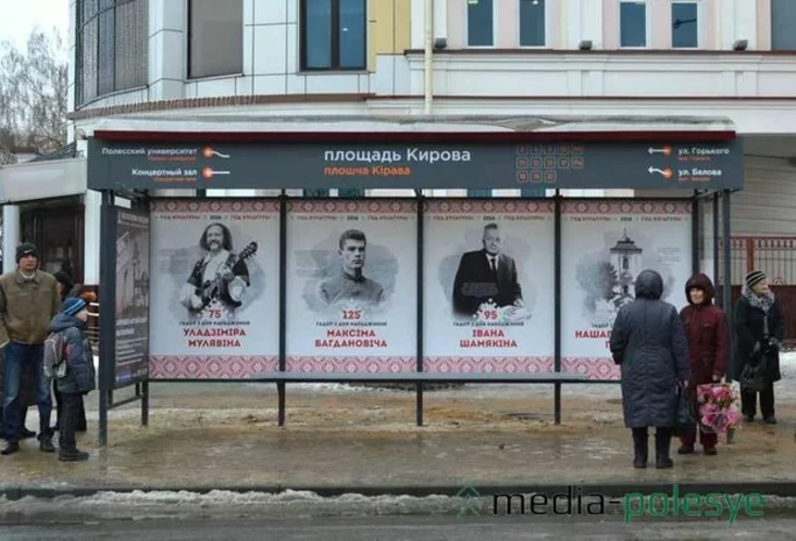В Пинске появилась остановка с изображением известных белорусов, сообщает сайт ipinsk.by.