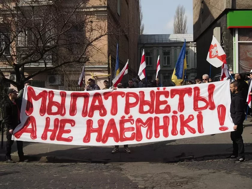 Белорусы-добровольцы пришли с транспарантом «Мы патриоты, а не наемники».