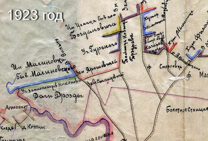 Эти 53 десятины (колонизационный участок + фольварок Мигуранка-Дуды) и стали основой будущих «Дроздов», т.е. именно мои предки дали название этой земле, а не наоборот. Но это название приживалось постепенно, и ещё в переписи 1926 года место, где жили мои Дрозды, называется сложно — хутор Дуды-Дрозды-Хмаринская пасека. На советской же карте 1930-х годов присутствует уже только название Дрозды.