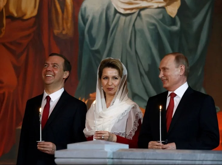 Российский президент в компании премьера и его жены Светланы присутствовали на богослужении, однако их мысли были заняты явно не делами духовными. Так, в объективы фотоаппаратов местных СМИ попал оживленный разговор российских политиков и их веселый смех прямо во время Божественной литургии.