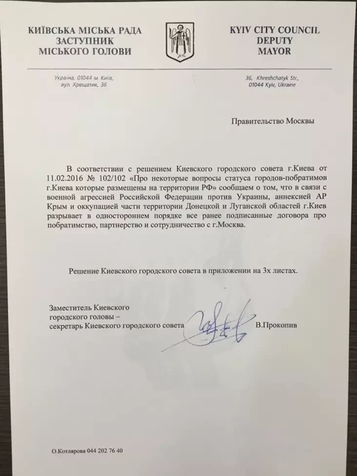 Прокопив также опубликовал на своей странице соответствующий документ, согласно которому, в соответствии с решением Киевсовета от 11 февраля, украинская столица разрывает в одностороннем порядке все ранее подписанные договоры о побратимстве, партнерстве и сотрудничестве с Москвой.