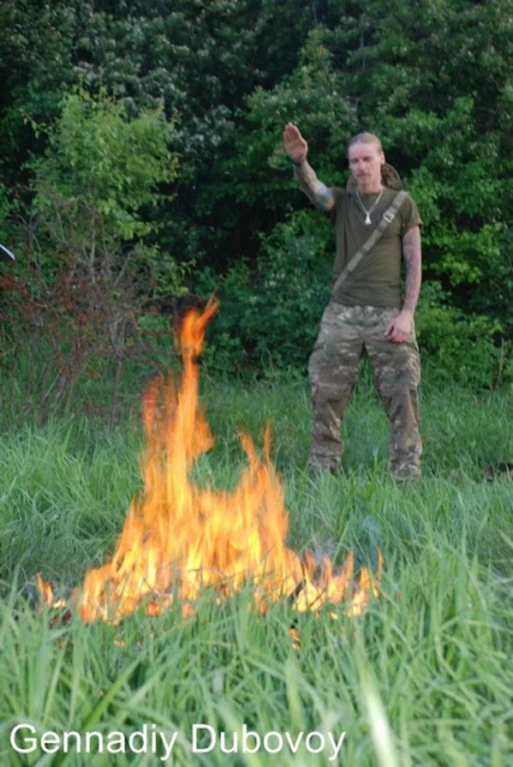Спиной к камере, с шевроном «Русича», стоит российский неонацист Ян Петровский с позывным «Славян».