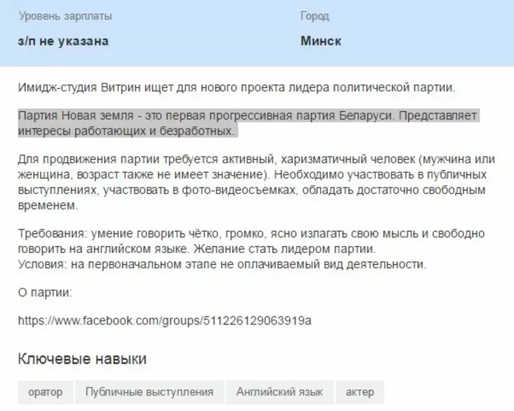 По объявлению ищут «лидера политической партии Новая Земля». Зарплата — от 400 долларов
